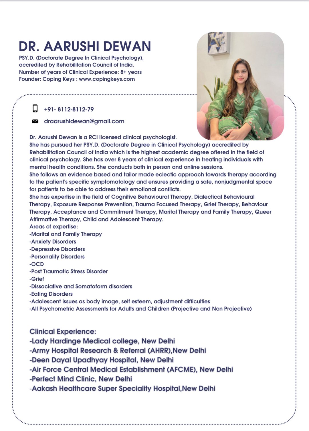 Dr. Aarushi Dewan is a RCI licensed clinical psychologist. She has done her PSY.D. (Doctorate Degree in Clinical Psychology) accredited by Rehabilitation Council of India which is the highest academic degree offered in the field of clinical psychology. She has over 8 years of clinical experience in treating individuals with mental health conditions. Her specialisation is Marital and Family Therapy. She has an expertise in the field of cognitive behavioural therapy for Depression and Anxiety Disorders, dialectical behavioural therapy for Personality Disorders , exposure response prevention for OCD , trauma focused therapy, grief therapy, behaviour therapy, queer affirmative therapy, child and adolescent therapy. Psychometric Assessments.